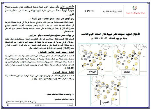 طرابلس 24 يونيو 2019 ( وال ) - اليكم نشرة الأحوال الجوية المتوقعة على ليبيا خلال الثلاثة الأيام القادمة ، بداية من اليوم الاثنين 24 - 06 - 2019 . م ، وفقاً للنشرة الصادرة عن إدارة التنبؤات بالمركز ، وهي نشرة جوية يومية تستعرض الأوضاع الجوية في جميع انحاء ليبيا مقسمة إلى أربعة اقسام كل قسم يمثل جزء من مساحة ليبيا . ملخص عام : تبقى درجات الحرارة مرتفعة على أغلب مناطق ليبيا ، بينما تكون معتدلة نسبياً على مناطق الساحل الشرقي ، وتسجل إنخفاض من مساء الغد على معظم المناطق وتستمر خلال الايام القادمة . رأس اجدير حتى سرت - سهل الجفارة - جبل نفوسة :- الطقس : السماء صافية. الرياح : جنوبية... إقرأ المزيد