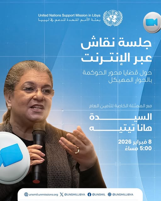 طرابلس 03 فبراير 2026 ( وال ) - أعلنت بعثة الأمم المتحدة للدعم في ليبيا عن تنظيم جلسة نقاش عبر الإنترنت مع الممثلة الخاصة للأمين العام للأمم المتحدة " هانا تيتيه " يوم الأحد ، ... إقرأ المزيد