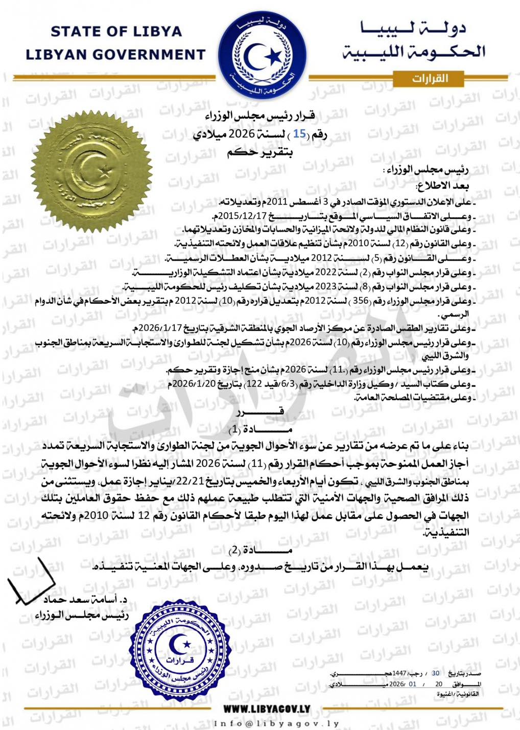 طرابلس 17 يناير 2026 (وال)-حذر مركز الارصاد الجوية اليوم السبت من تأثر مناطق الشمال الشرقي وبعض من مناطق الجنوب الغربي بداية من مساء يوم الاثنين الى نهاية يوم الثلاثاء برياح جنوبية شرقية نشطة الي ... إقرأ المزيد