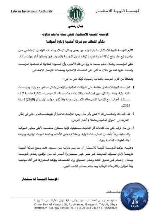 طرابلس 06 ديسمبر 2025 (وال) - أعلنت المؤسسة الوطنية للنفط، اليوم السبت، عن إطلاق المرحلة الأولى من مشروع السيطرة على حرائق آبار النفط والغاز، بالتعاون مع شركة ... إقرأ المزيد