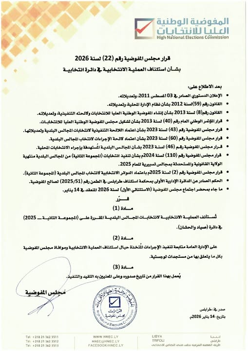 طرابلس 05 يناير 2026 (وال) - أعلنت الهيئة العامة لشؤون الحج والعمرة عن تمديد فترة التسجيل في قرعة موسم حج 1447هـ - 2026م، حتى يوم السبت 10 يناير. ... إقرأ المزيد