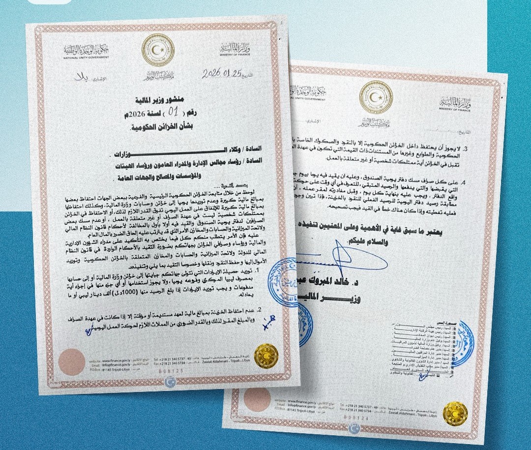 طرابلس 24 يناير 2026 م ( وال) – نفت إدارة التواصل والإعلام بالمجلس الرئاسي صحة القرار المتداول عبر بعض وسائل التواصل الاجتماعي والمنسوب إلى المجلس واللجنة المالية ... إقرأ المزيد