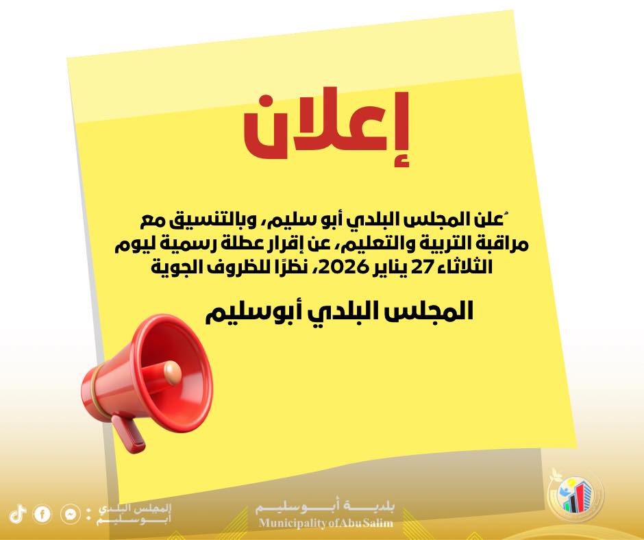 غدامس 15 يناير 2026 (وال) – ناقش المجلس البلدي غدامس اجتماعًا مع وكيل وزارة الزراعة لشؤون الثروة الحيوانية بحكومة الوحدة الوطنية، "تاج الدين همة"، العراقيل التي ... إقرأ المزيد