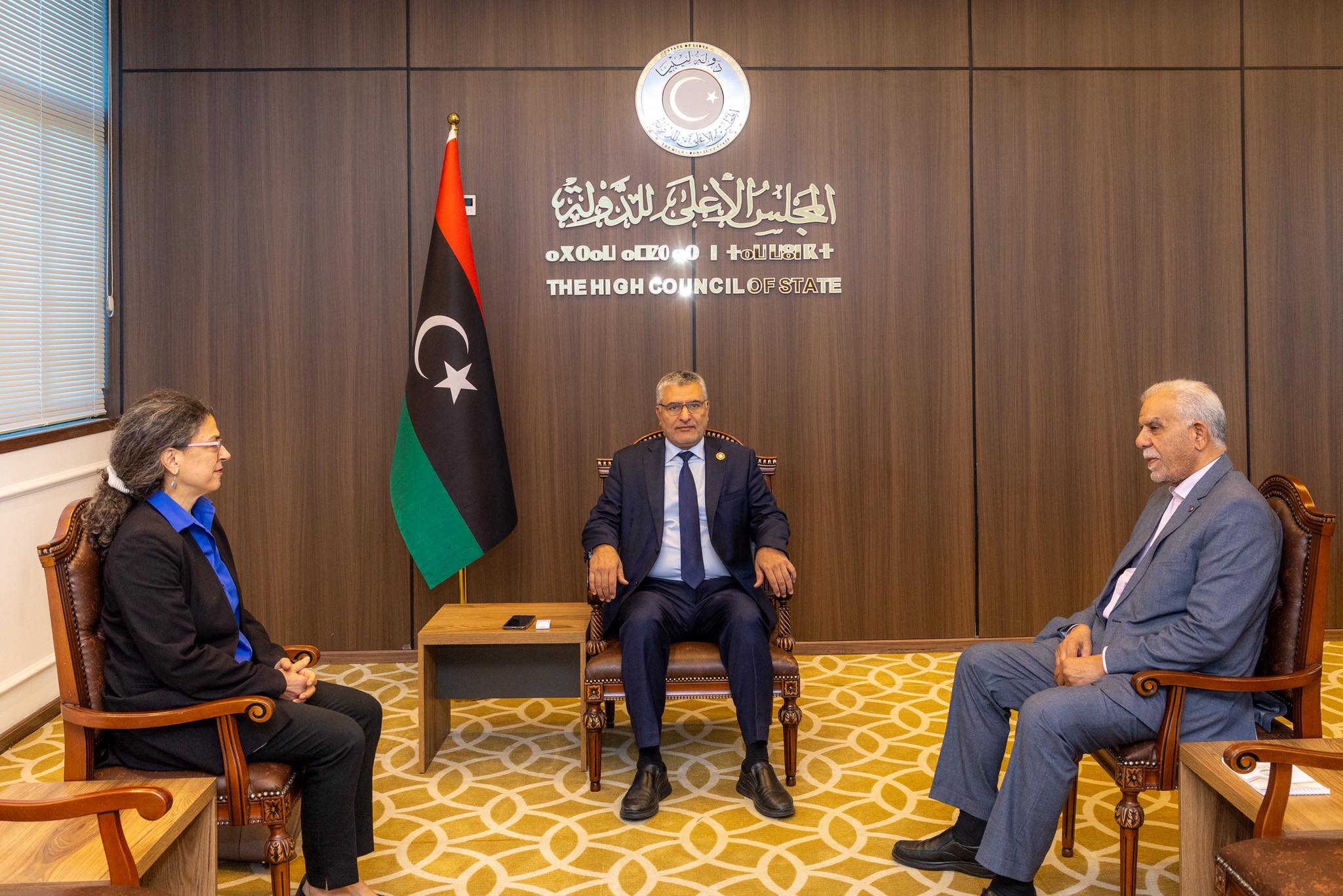 Tripoli, October 9, 2025 (LANA) – The President of the High Council of State, Mohamed Takala, accompanied by Second Deputy Speaker Moussa Faraj, discussed the political situation in Libya today, Thursday, with the Deputy Special Representative of the Secretary-General of the United Nations in Libya, Stephanie Khoury. They discussed the efforts made to advance the political process.