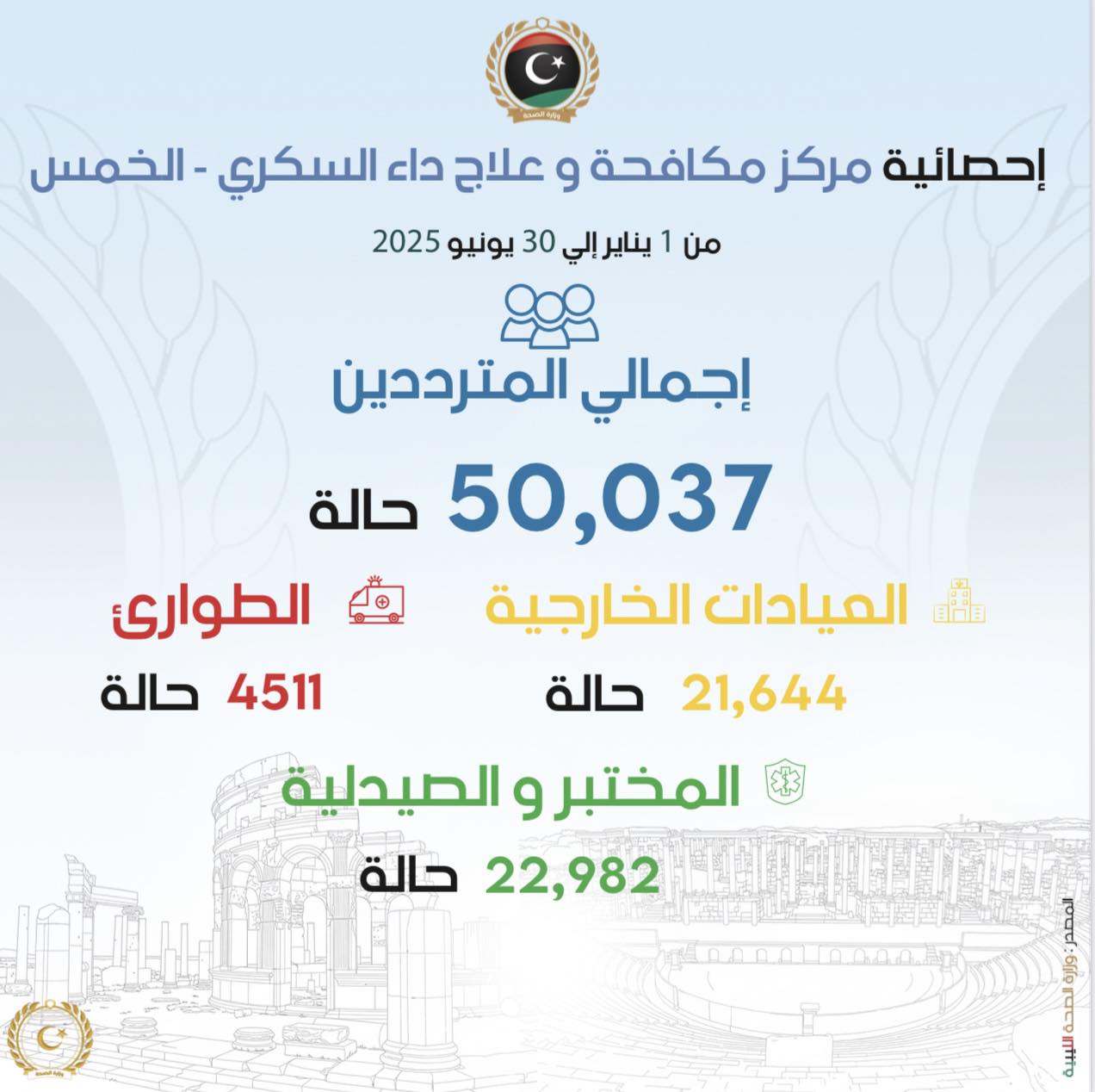 طرابلس 21 أكتوبر 2025(وال)- أظهر التقرير الإحصائي الصادر عن مركز مكافحة وعلاج داء السكري بمدينة الخمس، للفترة من 1 يناير إلى 30 يونيو 2025، تقديم 50.037 خدمة صحية.